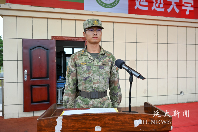 工學院輔導員蔣君豪、地理與海洋科學學院輔導員雷歡代表全體指導員發言;駐延吉某部隊毛歆志、駐琿春某部隊許天浩代表全體軍訓教官發言;文學院2025級新生劉昊軒、經濟管理學院2025級新生范澤錦代表全體參訓學生發言。