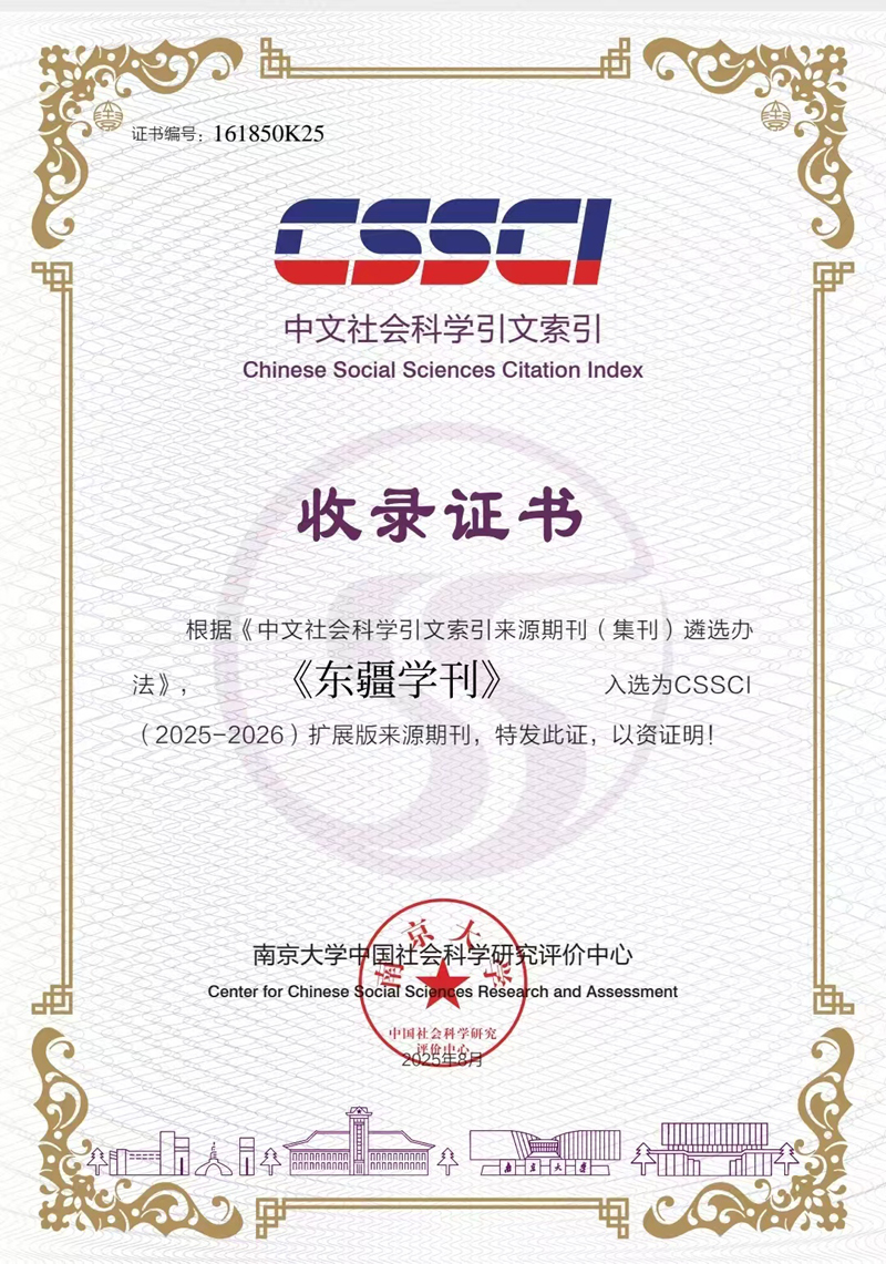 (《東疆學刊》編輯部供稿)近日,我校《東疆學刊》編輯部收到南京大學中國社會科學研究評價中心收錄證書。根據《中文社會科學引文索引來源期刊(集刊)遴選辦法》,《東疆學刊》再次入選為CSSCI(2025-2026)擴展版來源期刊。