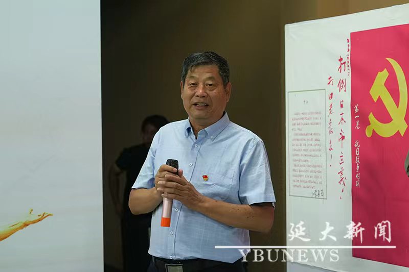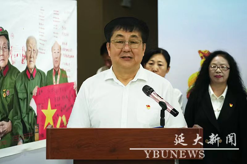 學(xué)校黨委原副書記、校關(guān)工委主任蔡奎龍?jiān)陂_幕式上講話。他強(qiáng)調(diào),此次展覽對(duì)于銘記歷史、緬懷先烈、傳承紅色基因具有重要意義。延邊是中國(guó)具有光榮傳統(tǒng)的革命根據(jù)地之一,歷次革命戰(zhàn)爭(zhēng)中,在中國(guó)共產(chǎn)黨的領(lǐng)導(dǎo)下,延邊有16300多名各族優(yōu)秀兒女挺身而出共赴國(guó)難,用生命詮釋“舍生取義、以身報(bào)國(guó)”的赤誠(chéng),“山山金達(dá)萊,村村烈士碑”便是無數(shù)延邊兒女鑄就的不朽豐碑。本次展覽中的老兵們皆是反法西斯戰(zhàn)爭(zhēng)的親歷者、見證者、幸存者,也是國(guó)家的寶貴財(cái)富。他們?cè)趹?zhàn)火紛飛的歲月里,挺身而出,為了正義、自由與和平,在反法西斯戰(zhàn)爭(zhēng)中建立了卓越功勛?;顒?dòng)旨在通過一幅幅珍貴的圖片,讓青年學(xué)生近距離了解反法西斯戰(zhàn)爭(zhēng)的歷史,感受老兵們的英勇無畏與犧牲精神,激勵(lì)新一代大學(xué)生努力學(xué)習(xí),挺膺擔(dān)當(dāng),成為有理想、敢擔(dān)當(dāng)、能吃苦、肯奮斗的新時(shí)代好青年。